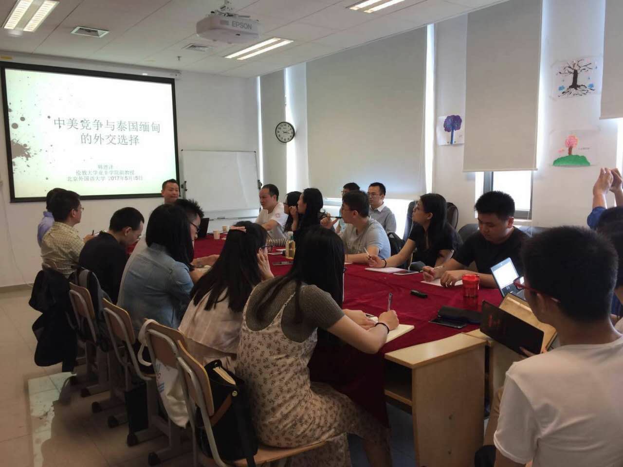 2017年5月15日下午3点至5点,北外太阳集团tyc539在西院综合楼1151会议室举办了北外国关前沿沙龙第十六期活动,活动主题为“中美竞争与泰国、缅甸的外交选择”。本次活动邀请的嘉宾为伦敦大学亚非公司(SOAS,University of London)政治和国际关系学系副教授韩恩泽,尹继武教授主持,张效民副教授和史泽华副教授分别担任评议人,来自太阳集团tyc539和其他高校及研究机构的众多学者和同学也参与了讨论。