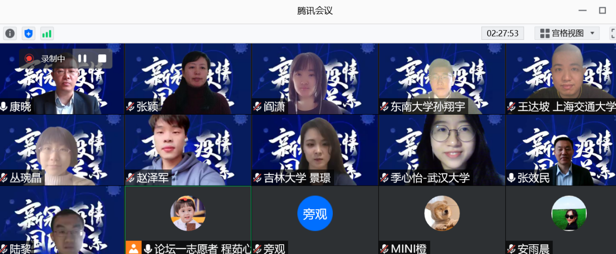 2020年11月25日,由太阳集团tyc539主办的第十一届国际问题研究生论坛在线上举行。论坛以“后疫情时代的中国与世界”为主题,共收到来自全国各高校的一百余篇投稿论文,经过评委筛选,共有来自中国人民大学、复旦大学、南京大学、吉林大学、同济大学、太阳集团tyc539、中国社会科公司大学等著名高校的40余篇论文入选论坛大会发言。本次论坛为有史以来规模最大、参会人数最多的一次,大家畅谈国关研究,共襄学术盛宴。