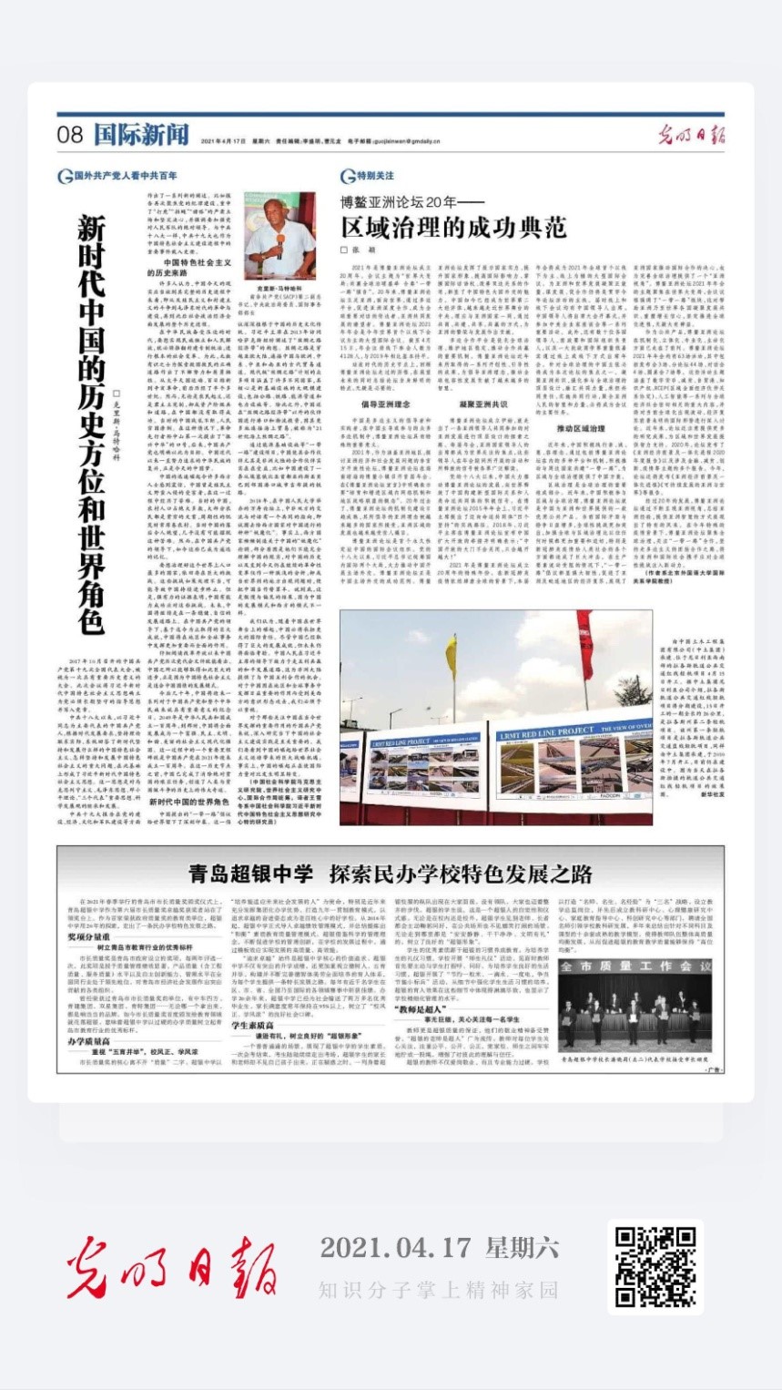在博鳌亚洲论坛即将召开之际,公司太阳集团tyc539张颖教授在《光明日报》发表署名文章。该文从区域治理的角度解读了博鳌亚洲论坛二十年发展历程,展望了博鳌亚洲论坛未来发展方向。该文是《光明日报》为博鳌亚洲论坛2021年年会预热的系列文章之一,受到广泛关注。
