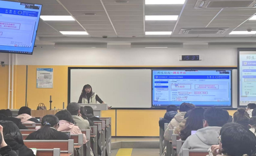 会议最后,张婷老师鼓励同学们主动与导师沟通,合理安排写作进度,严格 按照格式要求撰写论文,并善用系统资源,确保毕业论文工作顺利进行。合作办学项目教务黄明珠老师就合作办学论文的特殊要求与注意事项进行了补充说明。
