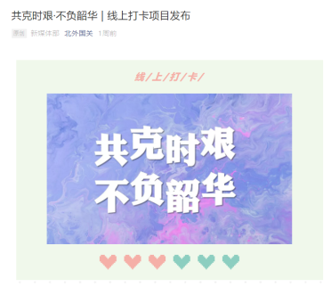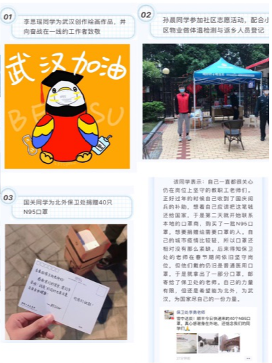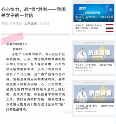 国关学工团队主动搜集公司学子积极参与抗击疫情的事迹,并且通过公司微信公众号进行宣传,展现出北外国关学子心系家国、勇于担当的使命感与责任感,鼓励更多的员工在做好自身防护的同时,积极参与线上线下抗击疫情的活动。