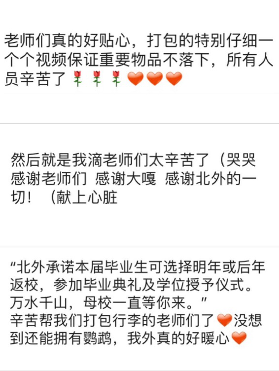 老师们的付出也感动着同学们,大家纷纷在朋友圈留言,表达对老师们的感激之情。
