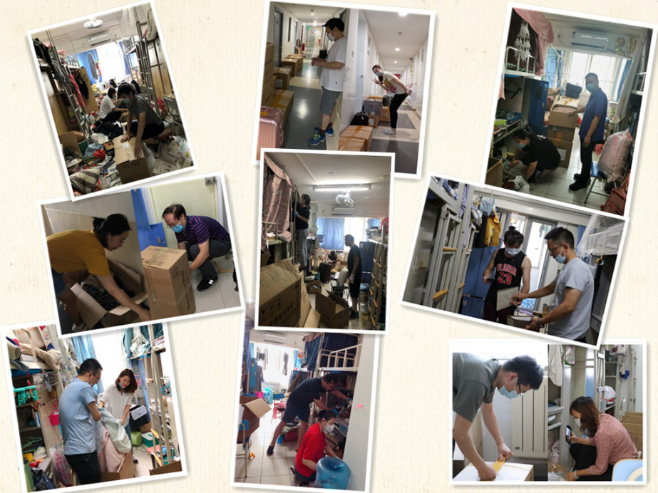 根据北京市和公司有关疫情防控的最新要求,公司2020届毕业生返校工作已经停止。为帮助不能返校的同学们处理好存放在宿舍的个人物品,公司领导、老师们集体出动,为每一位同学整理打包行李。