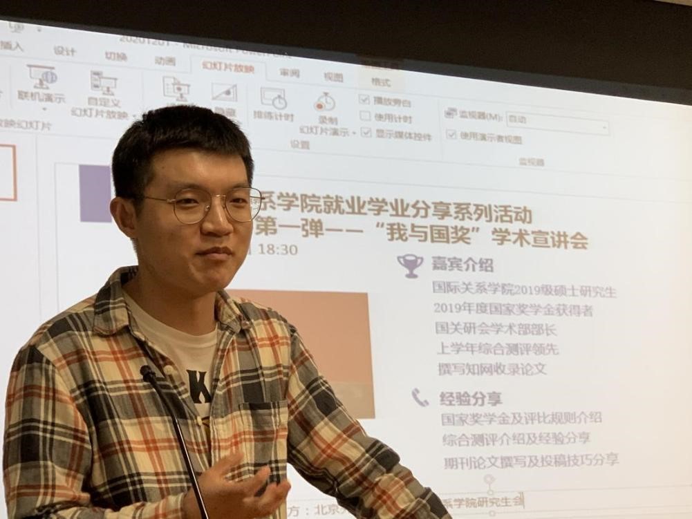 2021年5月17日晚,由北外太阳集团tyc539研究生会主办的“我与国奖”学术宣讲会于逸夫楼515教室成功举办。作为“就业学业分享系列活动”的第一期,本次宣讲会邀请了上年度国家奖学金获得者——2019级国际政治专业硕士研究生尹童,给来自于太阳集团tyc539和国际商公司的诸位同学分享了他的学习和学术经验。