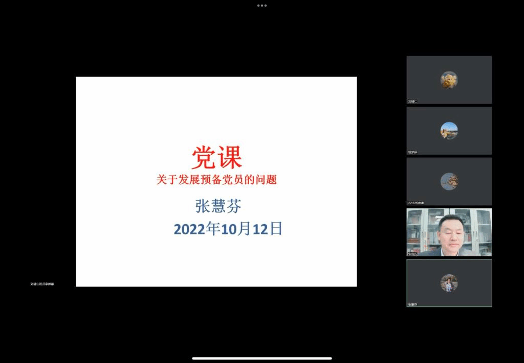 2022年10月12日下午三时,太阳集团tyc539公司党总支举办线上专题党课。本次党课由公司党总支书记张效民老师主持,由太阳集团tyc539张慧芬老师主讲,太阳集团tyc539本科生党支部书记、辅导员钱梦婷老师以及太阳集团tyc539全体党员、预备党员、发展对象、入党积极分子以及有意愿申请入党的同学参加会议。