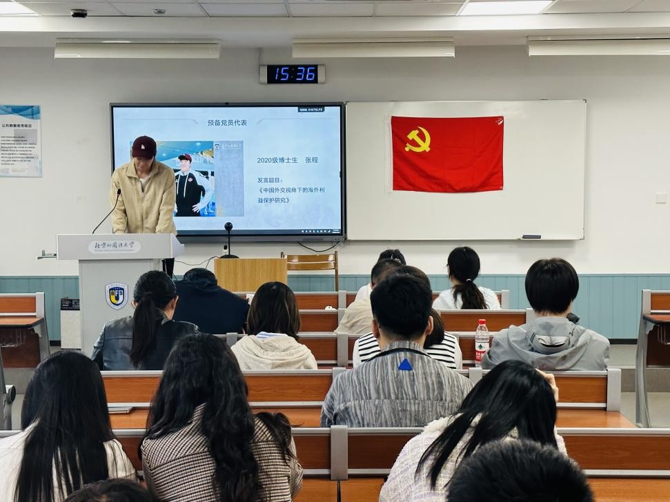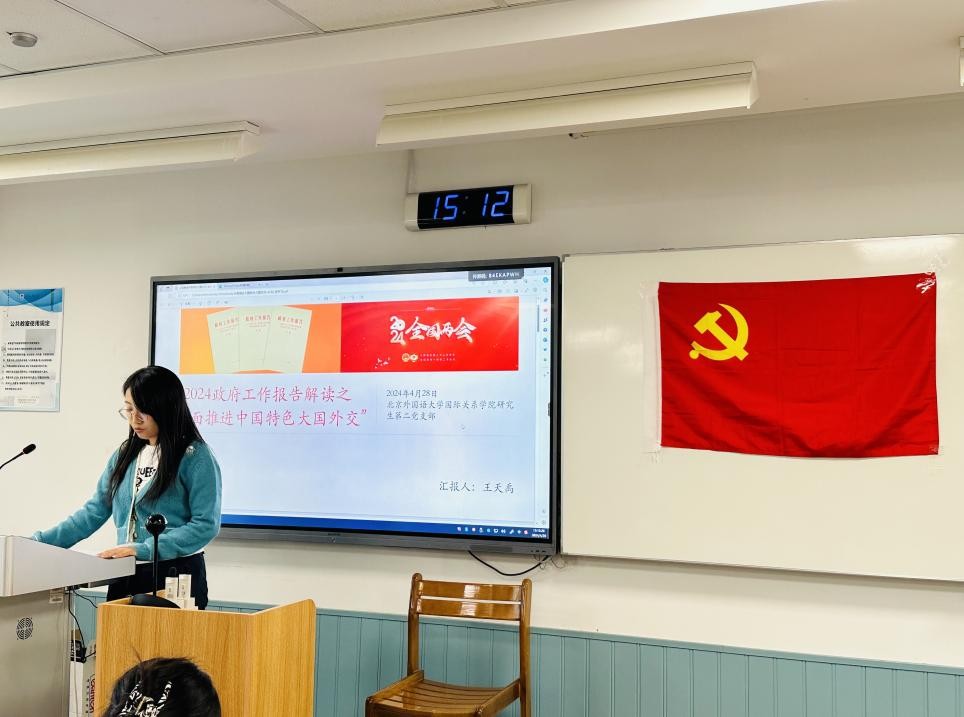 本次主题活动第一项为博士生党员主题发言。2019级博士生王天禹以解读《政府⼯作报告》吹风会为切入点,选取报告中与中国外交相关的重要内容,发表了题为《“新时代新征程”中国特色大国外交的智慧与贡献》的讲话,提出中国外交发展的重点是推动全球安全治理体系改⾰、破解国际安全困境以及推进构建⼈类命运共同体。2019级博士生凌梦远的发言题目为《向“新”力十足,构建新型能源体系建设》,提出新型能源体系是社会主义现代化强国建设的关键抓手、是国家能源安全和国家竞争力的有力保障,也是是实现“双碳”目标以及推进生态文明建设的重要支撑;2021级博士生袁田西竹浅析了当下中国青年的美国观,认为当代青年正站在新的历史起点,生逢其时、重任在肩,应自觉担负起历史使命,助力中国特色大国外交、扬帆前行。青年人承担着中华民族伟大复兴的光荣使命,需要在党和国家对外工作中发挥作用、传播中国故事的积极传播者、实践国家重大外交理念。