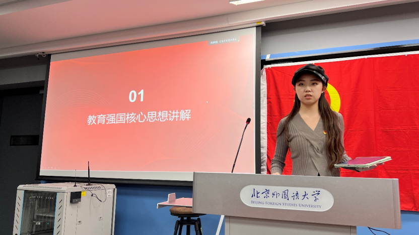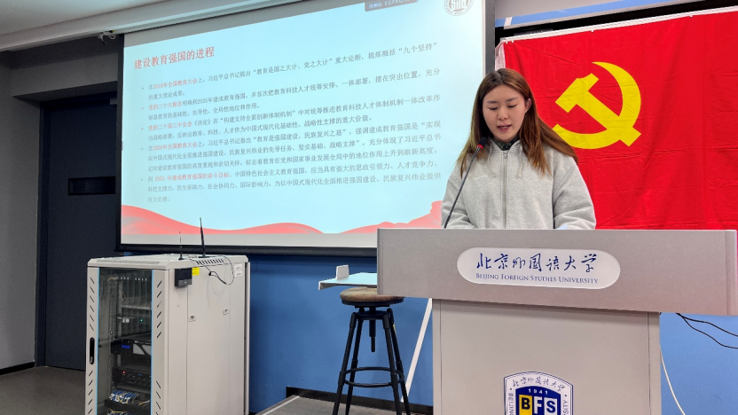 活动伊始,张方琼宇同志以教育强国思想的核心要义为主线,聚焦“坚持党的全面领导、落实立德树人、坚持以人民为中心、一体推进教育科技人才发展”四项原则,结合外交学科特点与员工视角,从“把牢政治方向、夯实德智体美劳全面培养、践行为民宗旨、拓展全球胜任力、强化科技赋能”五个维度,系统梳理了教育强国战略对外语外交人才培养的路径。她提出,要将教育强国的宏伟蓝图细化为课堂学习、科研训练、国际实践的具体行动,号召青年员工在知行合一中成长为堪当民族复兴重任的高素质外交人才。