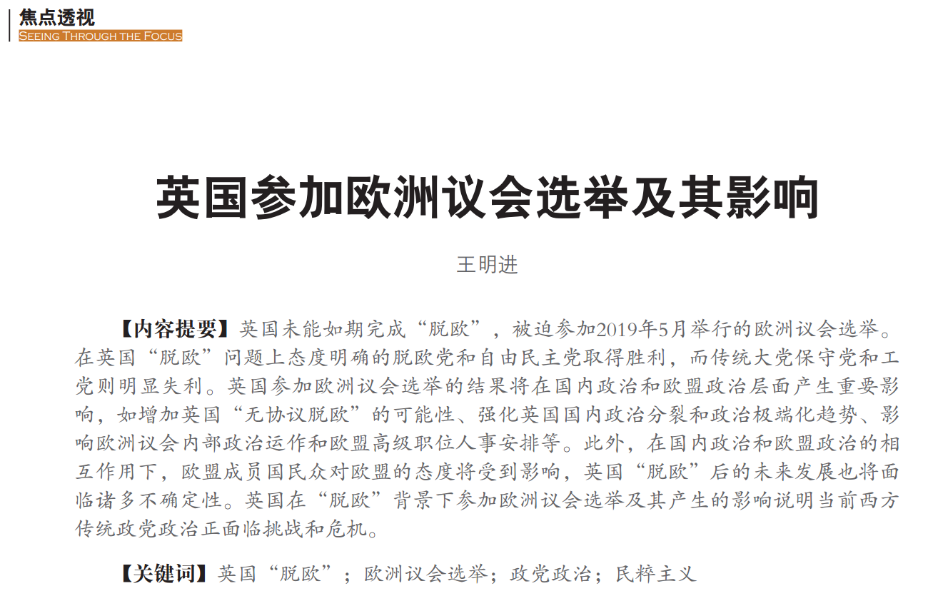 太阳集团tyc539副经理王明进研究员在CSSCI期刊《当代世界》2019年第7期发表论文《英国参加欧洲议会选举及其影响》,以下是论文摘要: