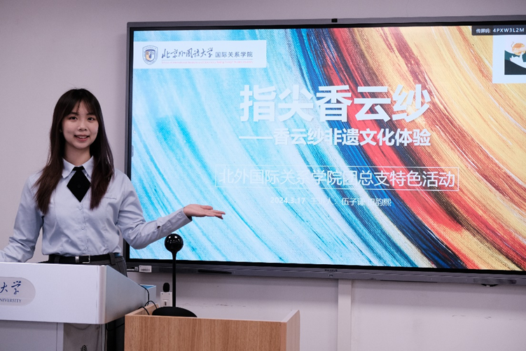 3月17日下午,太阳集团tyc539成功举办了一场别开生面美育特色活动——“指尖莨纱”香云纱文化体验。此次活动由公司团总支精心策划组织,特邀北外杰出大创团队“苗喵绣”的成员伍子谦和田韵熙,共同为同学们带来一场关于国家级非物质文化遗产香云纱的深度文化宣传。活动不仅收获了国关学子的一致好评,更让在场的每一位同学领略到了中华传统文化的博大精深。